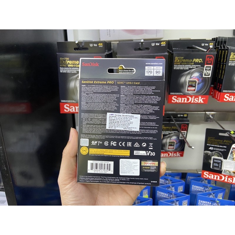 🎊 Thẻ nhớ SanDisk Extreme PRO SDXC UHS-I Speed Class 3 Thẻ nhớ SanDisk Extreme PRO SDXC UHS-I Speed Class 3 là dòng thẻ nhớ phân khúc tốc độ thuộc hàng nhanh của SanDisk, cung cấp tốc độ cực khủng để đáp ứng yêu cầu của chất lượng video 4K UHD trên máy ảnh DSLR, máy ảnh kỹ thuật số hoặc máy quay video HD. Với tốc độ truyền dữ liệu lên đến 170MB/s giúp di chuyển dữ liệu của bạn nhanh chóng, tốc độ ghi lên đến 90MB/s xử lý các chế độ chụp nhanh, chụp liên tiếp và chụp RAW với JPEG cực kỳ dễ dàng. Tất cả các sản phẩm SanDisk được sản xuất với tiêu chuẩn cao và đã được thử nghiệm chặt chẽ, vì vậy bạn có thể tự tin vào chất lượng vượt trội, hiệu suất và độ tin cậy của mỗi sản phẩm SanDisk.