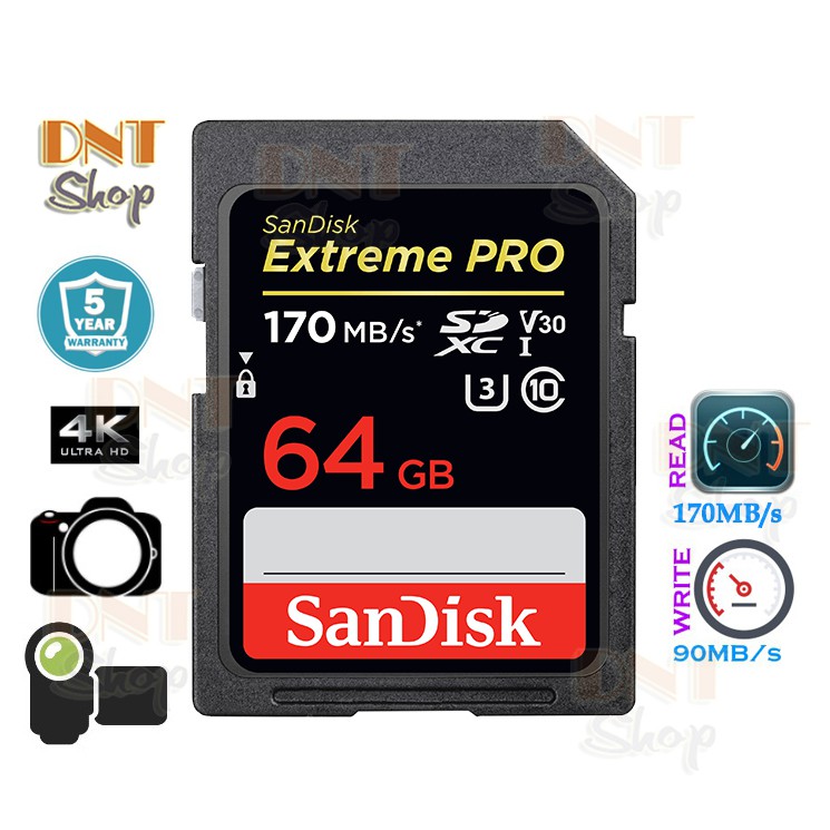 🎊 Thẻ nhớ SanDisk Extreme PRO SDXC UHS-I Speed Class 3 Thẻ nhớ SanDisk Extreme PRO SDXC UHS-I Speed Class 3 là dòng thẻ nhớ phân khúc tốc độ thuộc hàng nhanh của SanDisk, cung cấp tốc độ cực khủng để đáp ứng yêu cầu của chất lượng video 4K UHD trên máy ảnh DSLR, máy ảnh kỹ thuật số hoặc máy quay video HD. Với tốc độ truyền dữ liệu lên đến 170MB/s giúp di chuyển dữ liệu của bạn nhanh chóng, tốc độ ghi lên đến 90MB/s xử lý các chế độ chụp nhanh, chụp liên tiếp và chụp RAW với JPEG cực kỳ dễ dàng. Tất cả các sản phẩm SanDisk được sản xuất với tiêu chuẩn cao và đã được thử nghiệm chặt chẽ, vì vậy bạn có thể tự tin vào chất lượng vượt trội, hiệu suất và độ tin cậy của mỗi sản phẩm SanDisk.