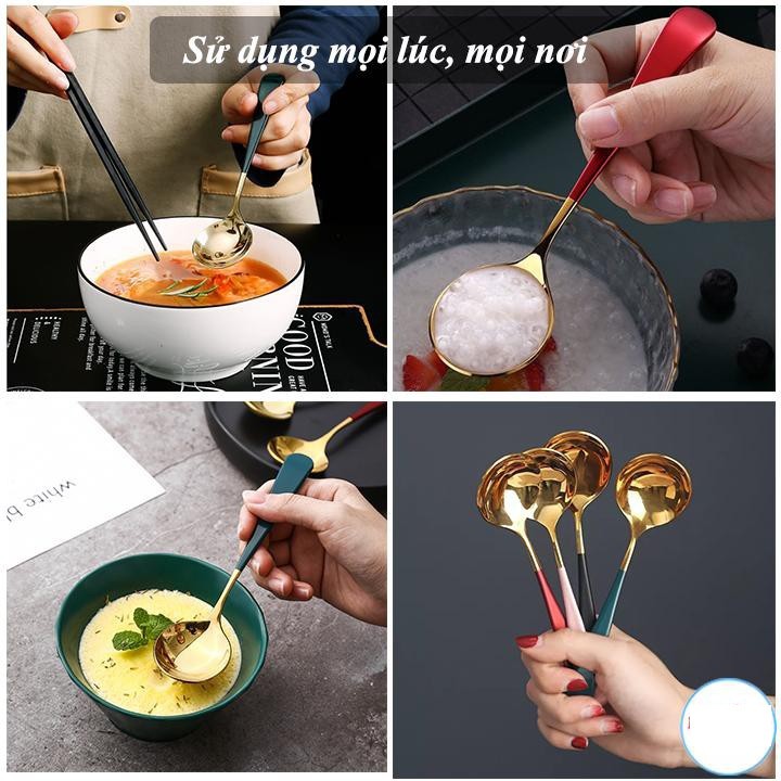 ✔️ Thìa Inox Mạ Vàng Cán Dài Nhiều Màu Với thiết kế tròn, rộng phù hợp khuôn miệng, dễ dàng xúc cơm, soup, cháo...