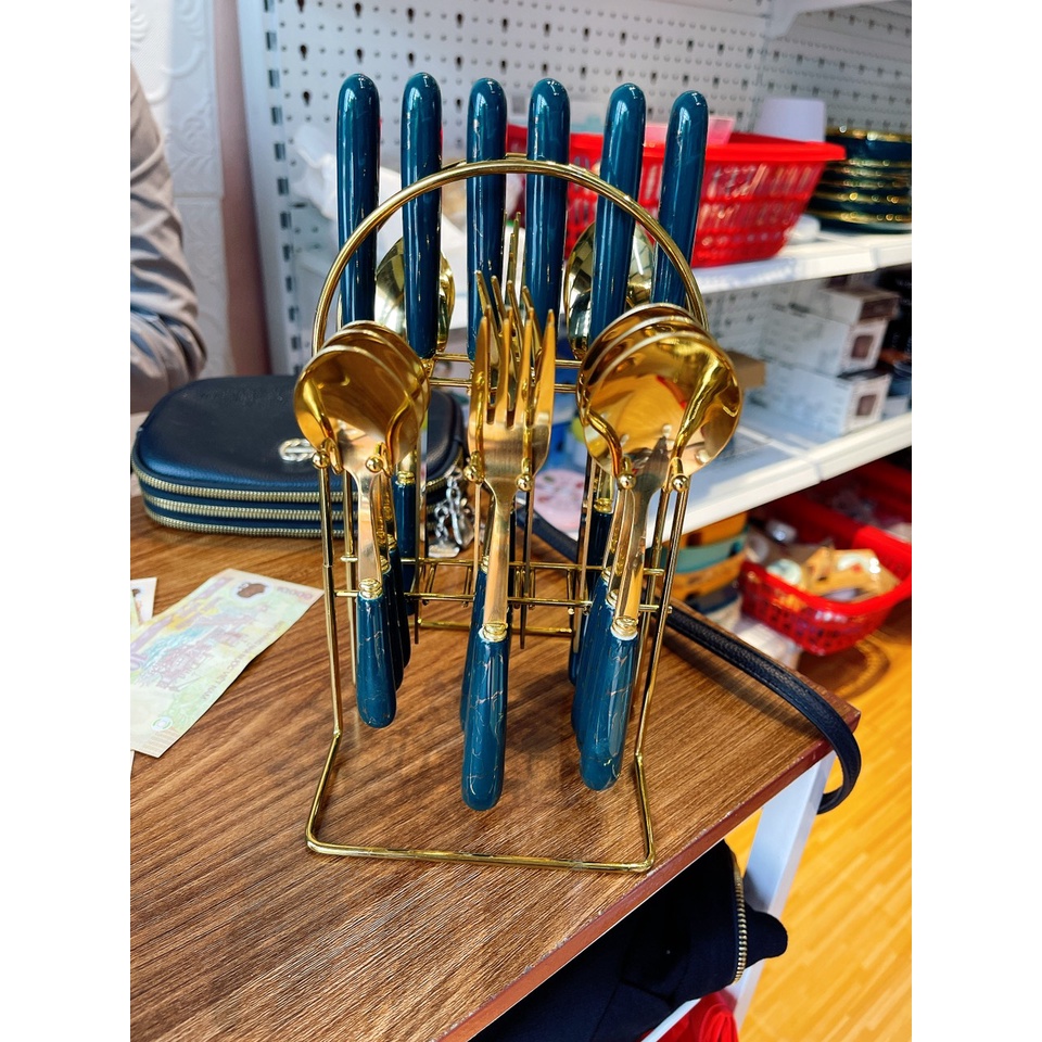 Bộ thìa dĩa dao 24 món inox mạ vàng cao cấp tặng kèm khay treo, sáng bóng bền đẹp