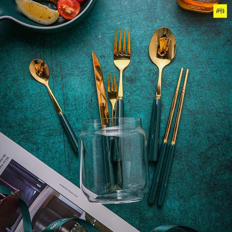 Nhà cửa & Đời sống > Bộ đồ bàn ăn > Bộ dao kéo || Thìa dĩa dao dĩa đũa thìa muỗng đũa inox mạ vàng tay cầm gốm xanh cổ vịt cao cấp phong cách Âu [Phụ kiện bàn ăn]Còn hàng