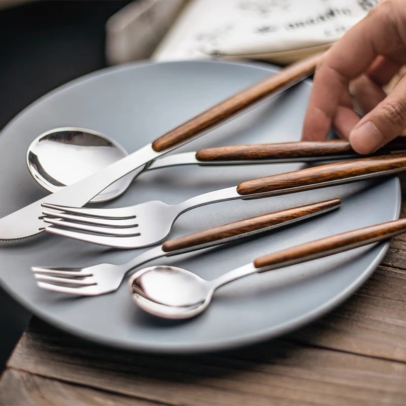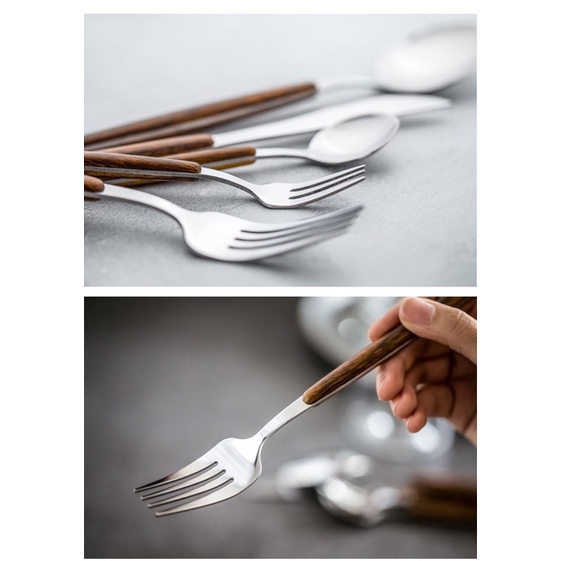 - Chất liệu bộ thìa dĩa: thép inox 304 an toàn không gỉ và cán gỗ mài sang trọng