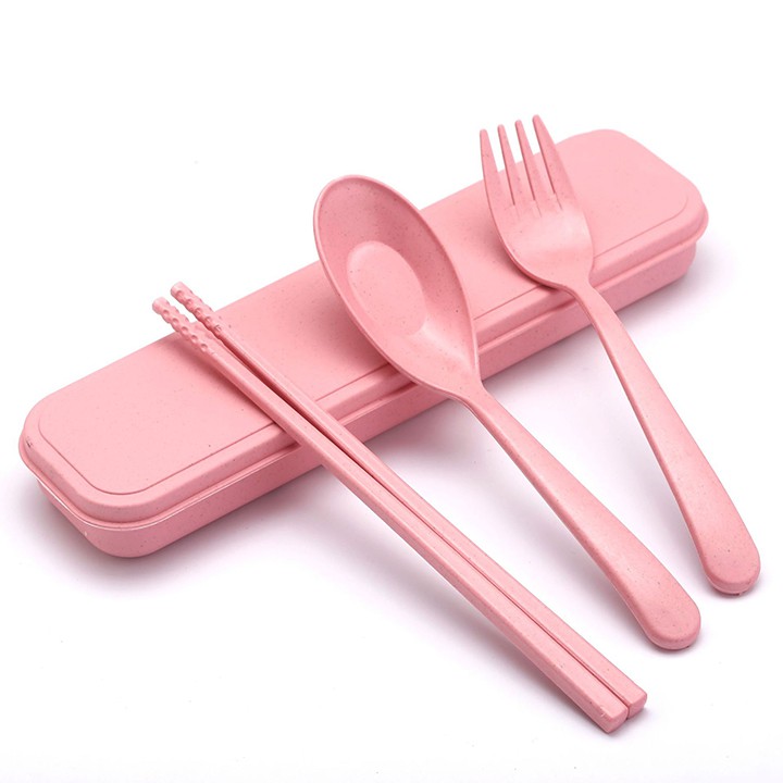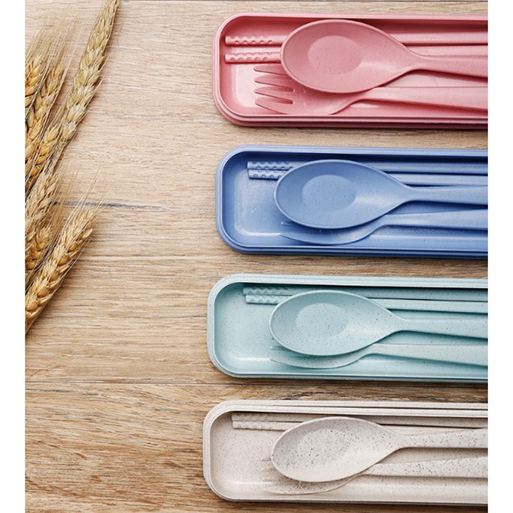 Bộ thìa dĩa đũa muỗng nhựa lúa mạch có hộp cá nhân tiện lợi văn phòng học sinh viên vệ sinh an toàn nhiều màu