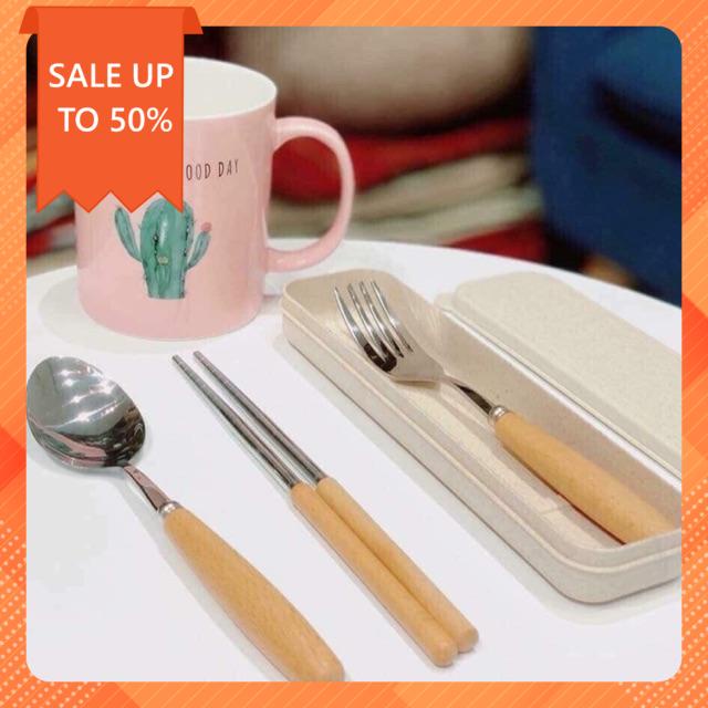 - Bộ gồm đũa, thìa và dĩa inox rất đẹp cán gỗ sồi, đựng trong 1 hộp nhựa lúa mạch sang trọng. Dùng mang cơm đi làm, mang đi du lịch hay picnic tiện lợi.