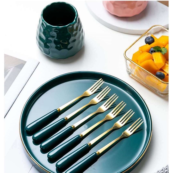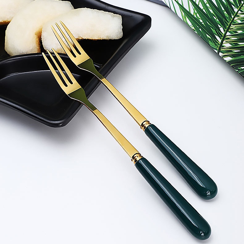 Nhà cửa & Đời sống > Bộ đồ bàn ăn > Dĩa || Thìa dĩa mạ vàng cán sứ màu xanh nĩa ăn trái cây / muỗng cà phê dài 15cmCòn hàng