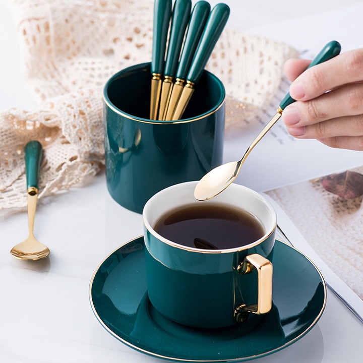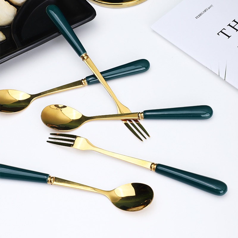Thìa dĩa cán sứ màu xanh mạ vàng