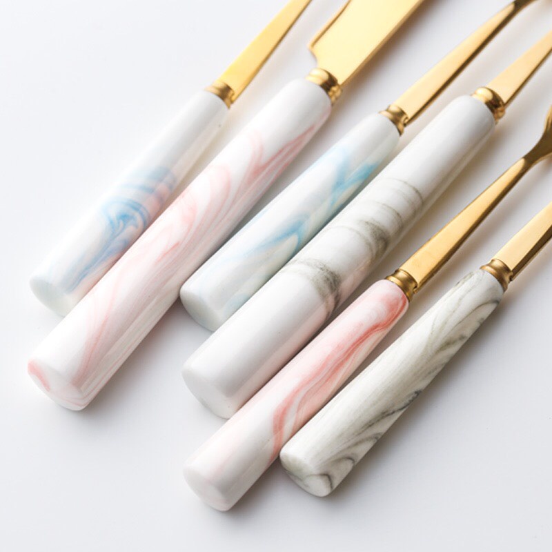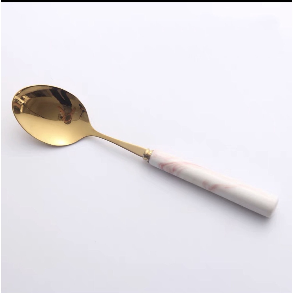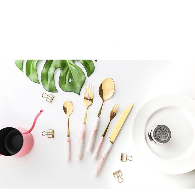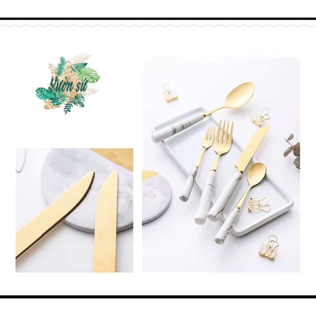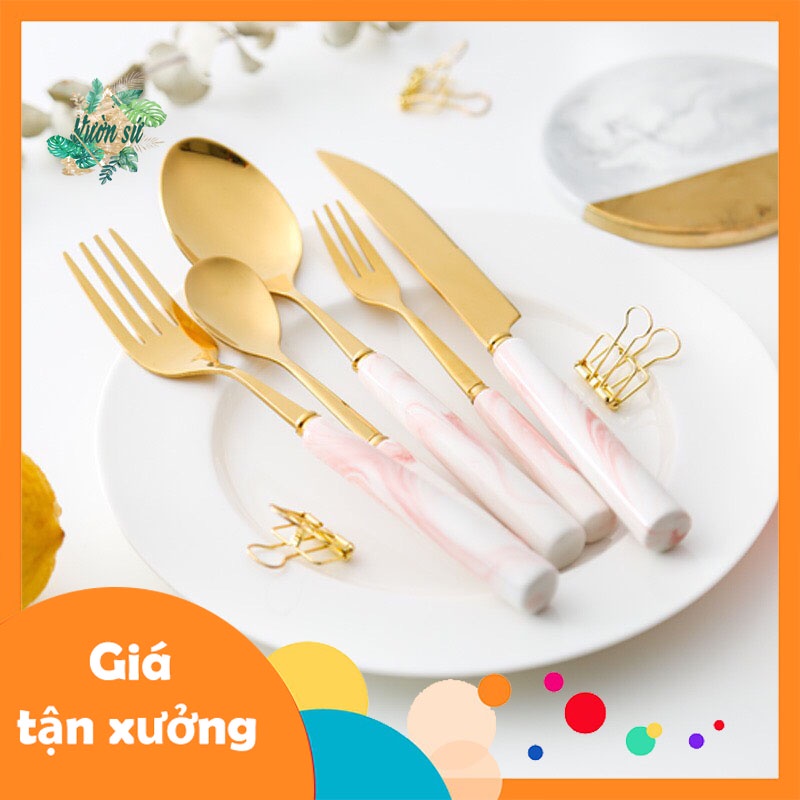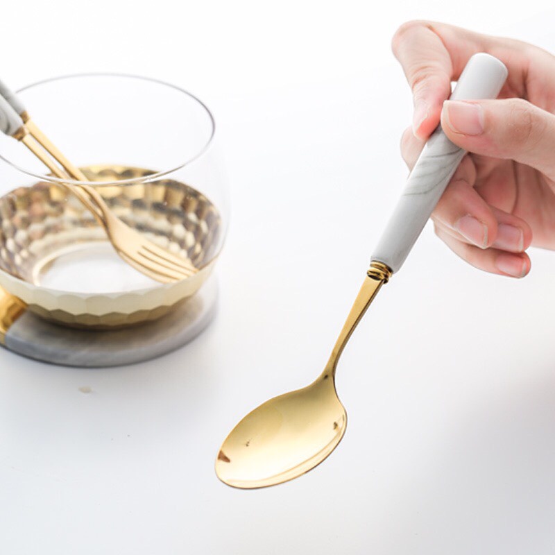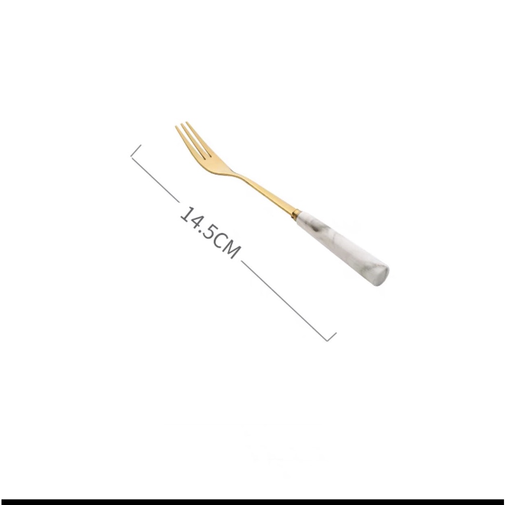 Thân dĩa làm inox không gỉ 304 mạ vàng, phần chuôi được bọc sứ men vân đá cẩm thạch cực sang trọng hot trend 2021