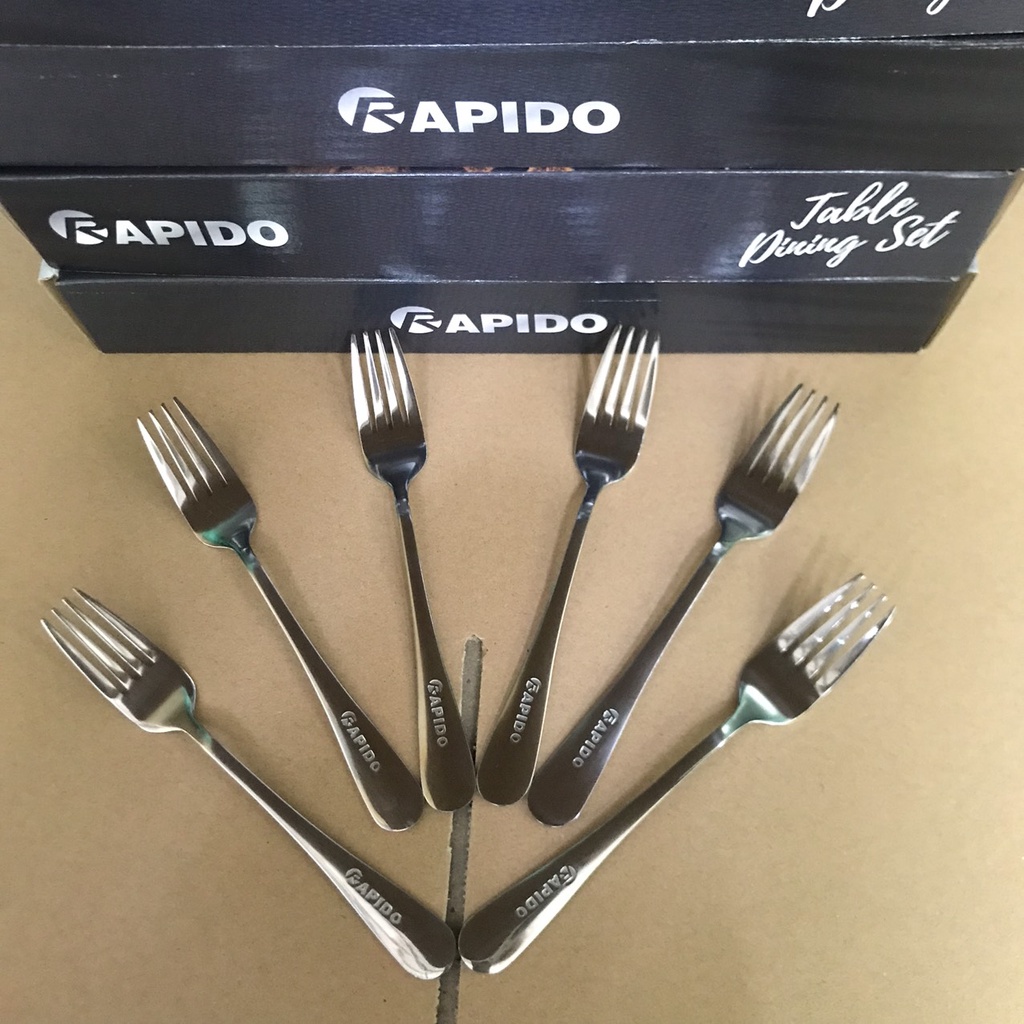 Bộ thìa dĩa 12 món Rapido sản xuất với công nghệ hiện đạiQuy cách đóng 1 hộp 12 món gồm: 6 thìa và 6 dĩa inox sáng bóng, chắc chắn.