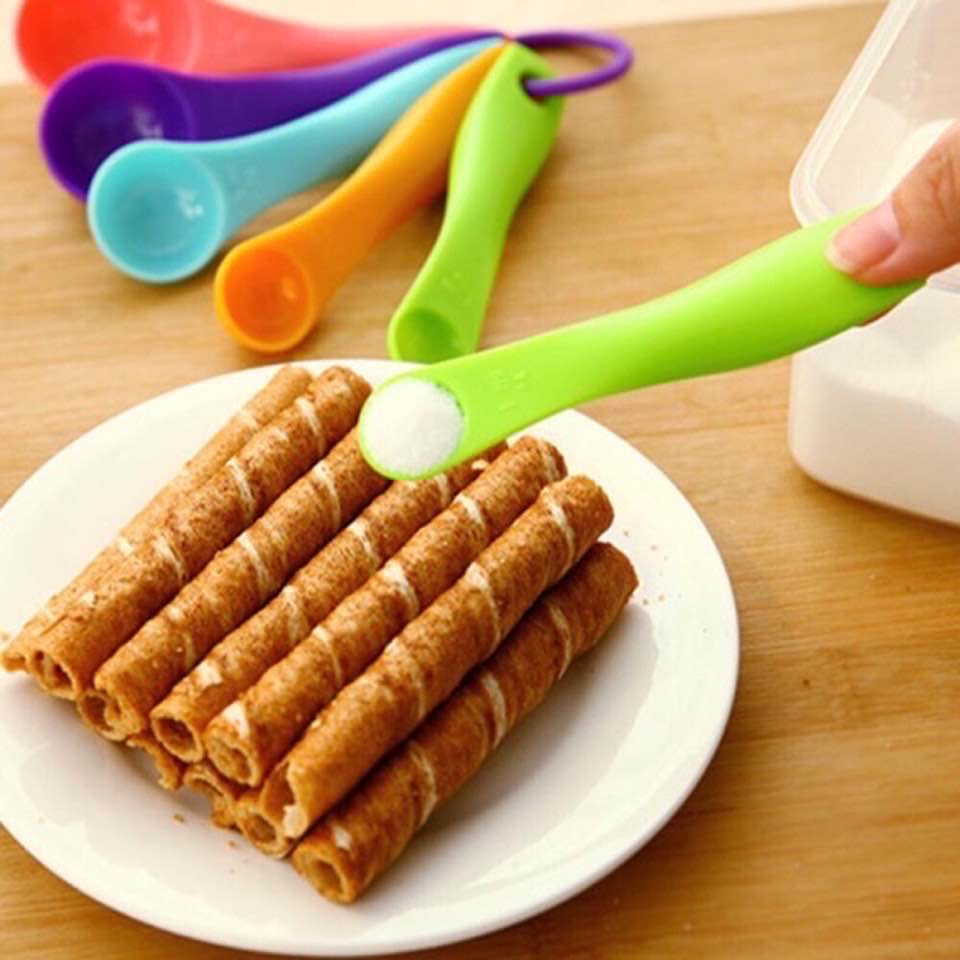 Bộ thìa đong nhựa cứng, chất đẹp 5 màu.- Bộ 5 muỗng đo lường bằng nhựa cao cấp thuận tiện cho bạn đo lường chính xác nguyên liệu để chế biến thức ăn.