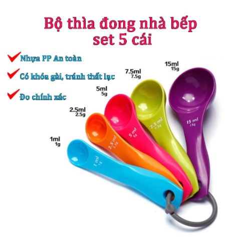 Bộ thìa đong 5 món bằng nhựa an toàn, bộ muỗng đong 5 cái định lượng chính xác cho nhà bếp
