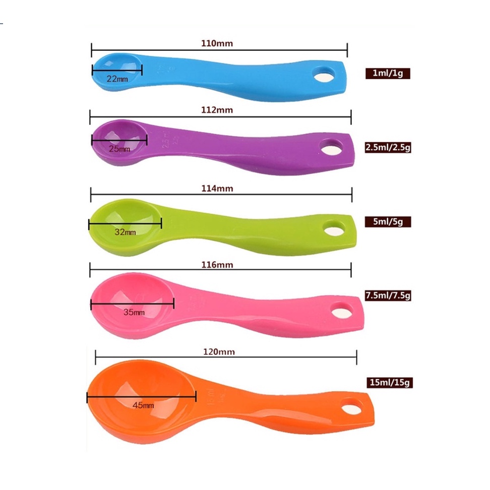 - Bộ 05 muỗng đo lường bằng nhựa cao cấp thuận tiện cho bạn đo lường chính xác nguyên liệu để chế biến thức ăn.