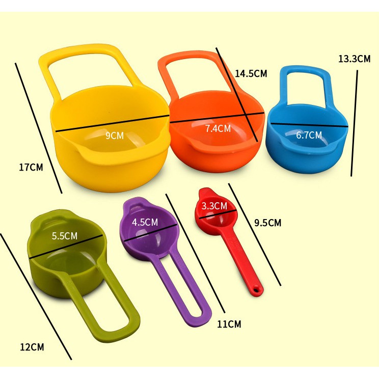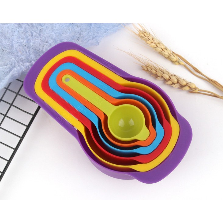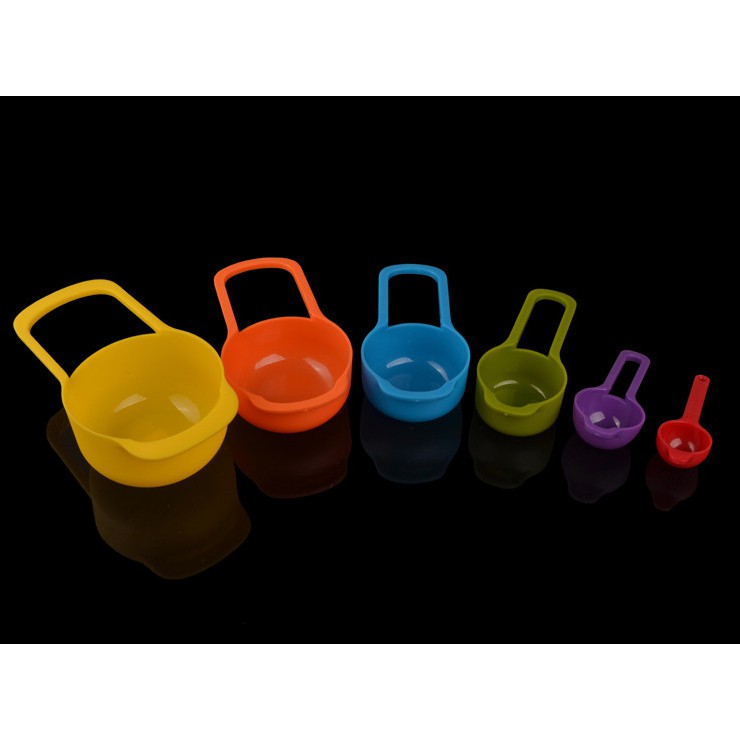 Bộ 6 muỗng đo lường đủ màuGồm: 1/2 tbsb + 1 tbsp + 1/4 cup + 1/3 cup + 1/2 cup + 1 cup