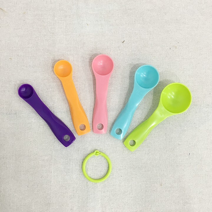 Bộ 5 muỗng đo lường bằng nhựa cao cấp thuận tiện cho bạn đo lường chính xác nguyên liệu để chế biến thức ăn.Kiểu dáng đơn giản, thiết kế xinh xắn. Có móc khóa giúp cố định bộ muỗng chắc chắn, dễ dàng treo móc, bảo quản.