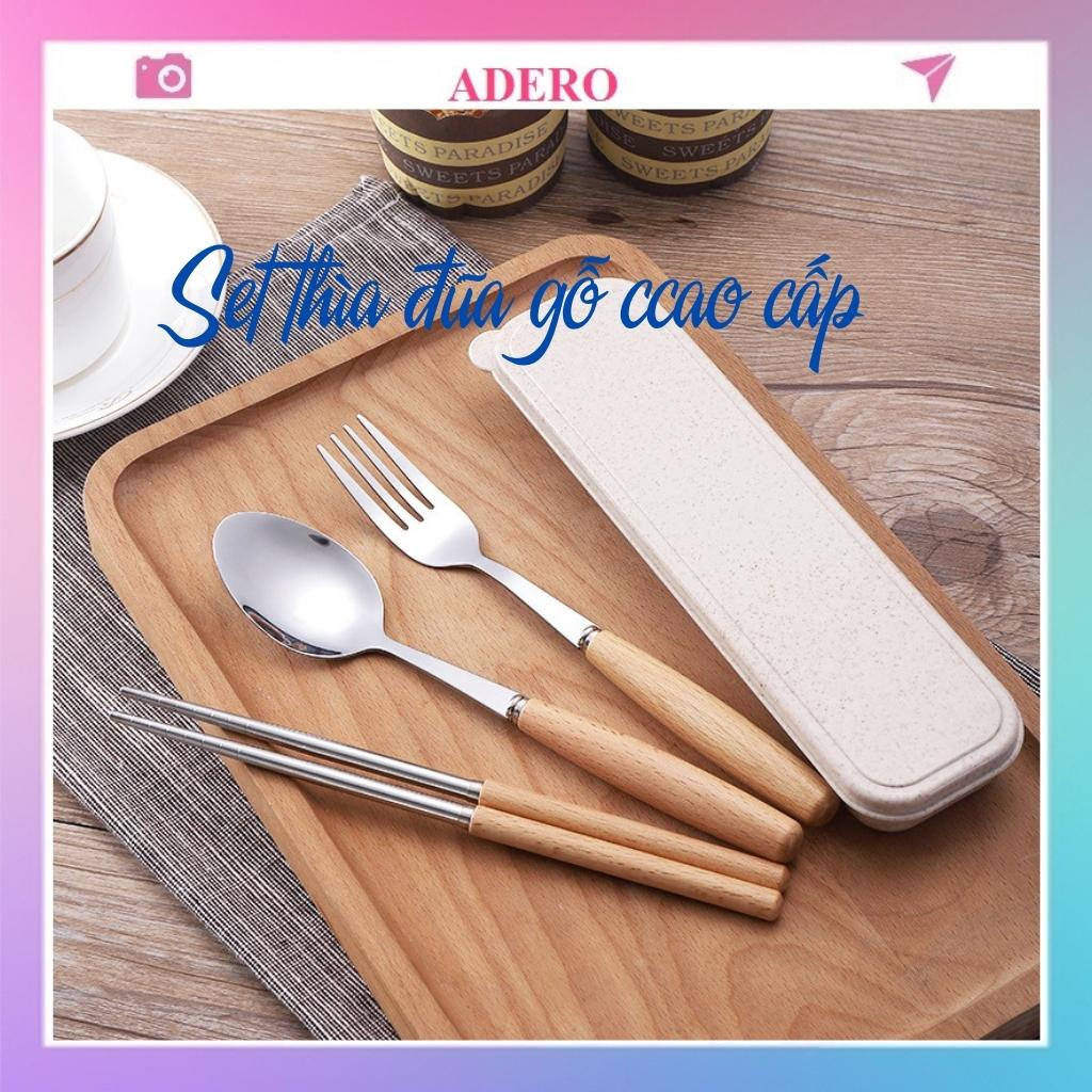Bộ thìa đũa cá nhân ADERO muỗng đũa văn phòng có hộp thân inox cán gỗ chống nóng AD45