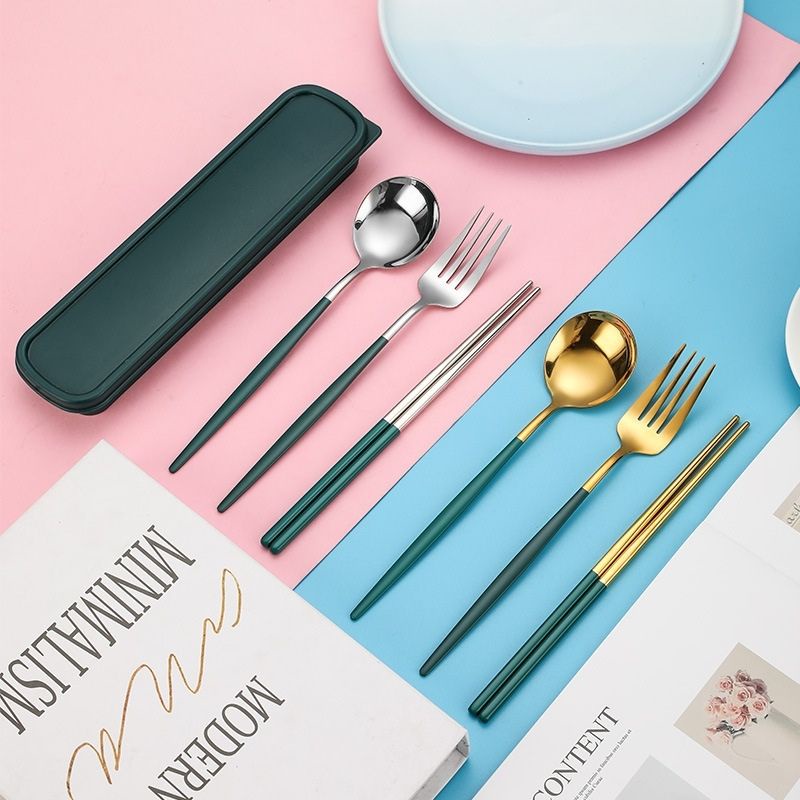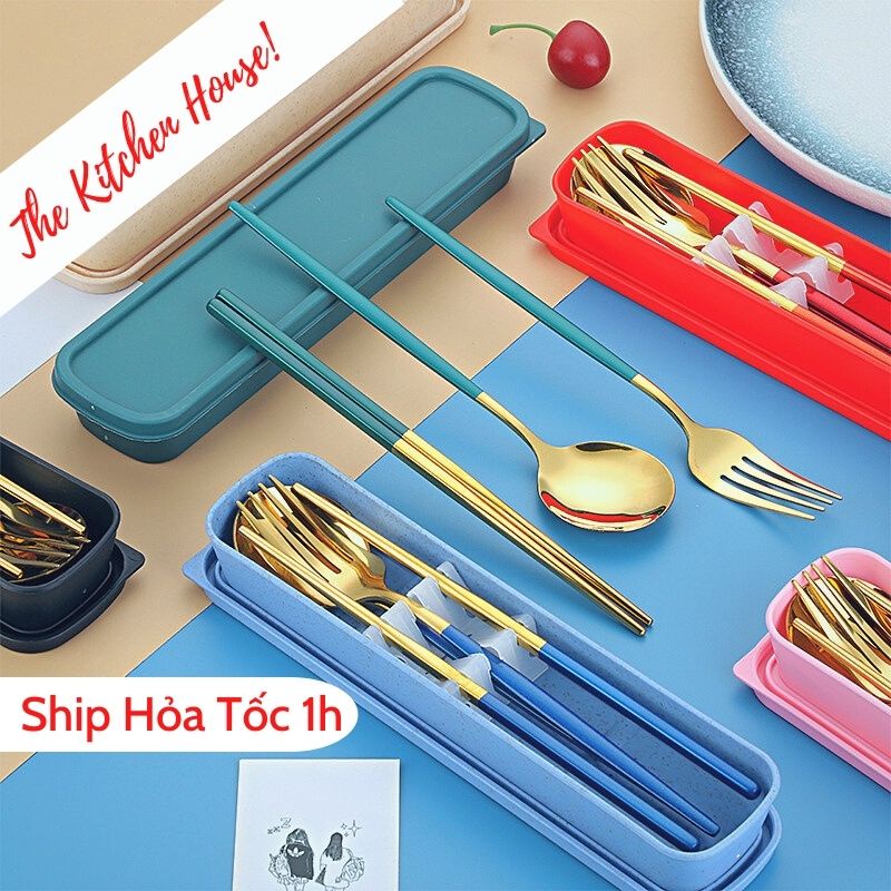 Bộ đũa thìa dĩa muỗng cá nhân Inox 304 cao cấp cán dài, mạ vàng ăn cơm văn phòng, dã ngoại kèm hộp đựng TheKitchenHouse