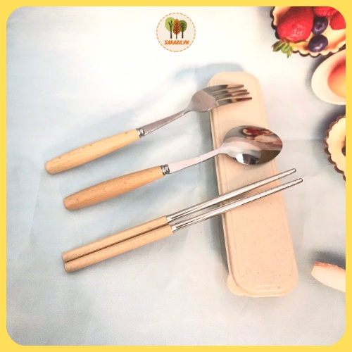 - Bộ gồm đũa, thìa và dĩa inox rất đẹp cán gỗ sồi, đựng trong 1 hộp nhựa lúa mạch sang trọng. Dùng mang cơm đi làm, mang đi du lịch hay picnic tiện lợi.