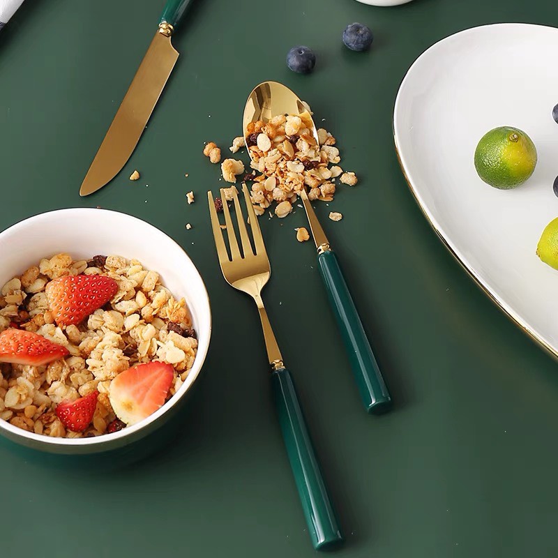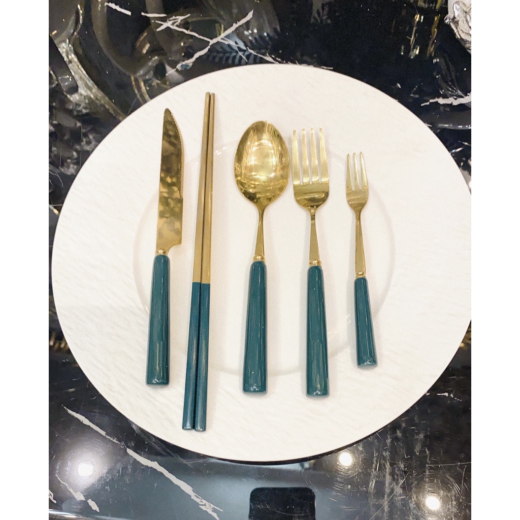 Thìa, đũa, dĩa, dao phong cách Bắc Âu cao cấp, thiết kế tinh tế độc đáo, màu vàng cán sứ xanh đầm tay, tiện dụng