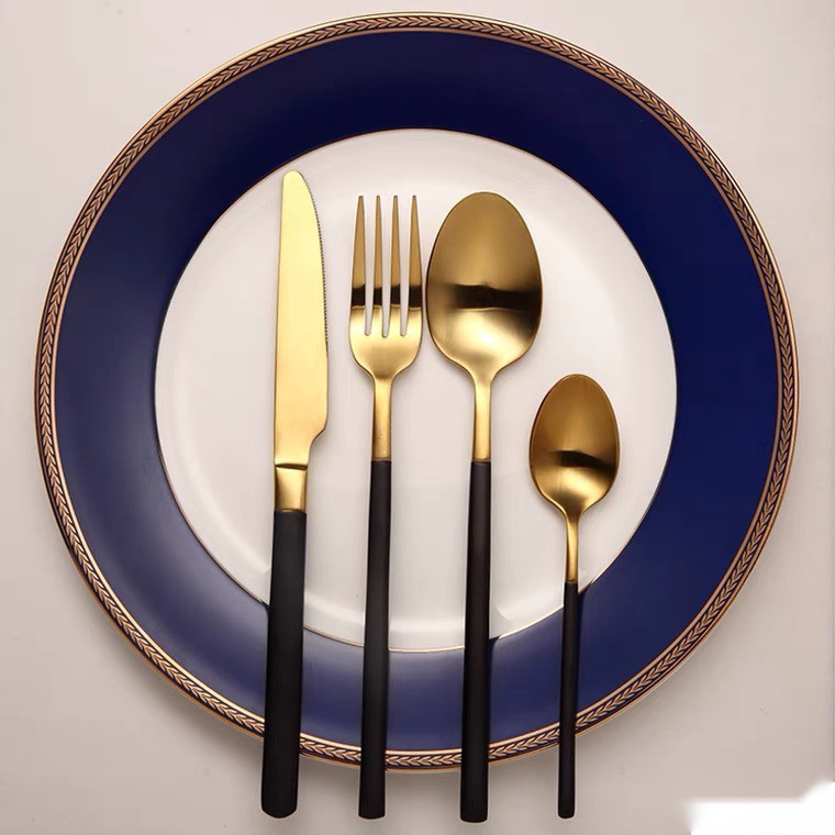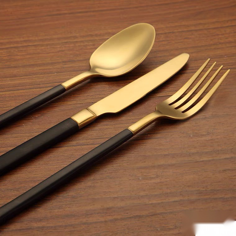 Thìa, đũa, dĩa, dao phong cách Bắc Âu cao cấp, màu vàng đồng, sang trọng, cao cấp, cán đen cao cấp
