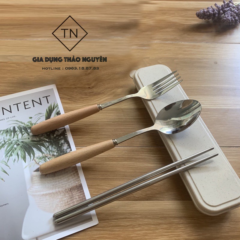 Bộ Thìa Đũa Dĩa Inox Cán Gỗ Lúa Mạch Có Hộp Đựng Cao Cấp Tiện Lợi