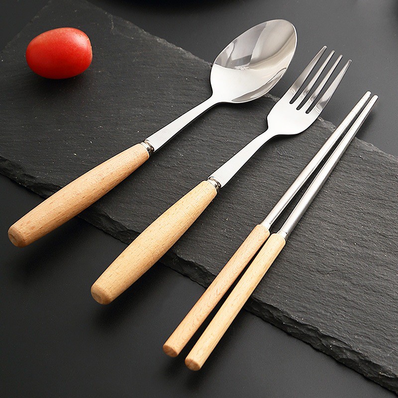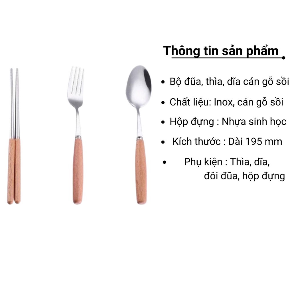 Bộ thìa đũa dĩa inox cán gỗ sồi, có hộp đựng bằng nhựa sinh học dùng cho văn phòng ,cá nhân, gia đình tiện dụng