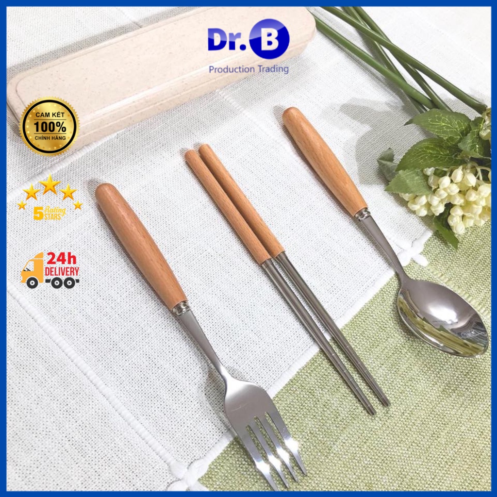 Bộ Thìa Đũa Dĩa Inox cán gỗ sồi sang trọng( Có Hộp Đựng)