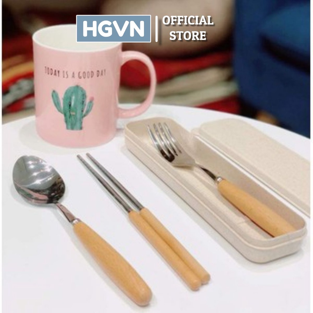 Bộ Thìa Đũa Dĩa inox cán gỗ sồi kèm hộp☘️ Bộ thìa - dĩa - đũa inox kết hợp cán gỗ , hộp đựng bằng nhựa lúa mạch sang - xịn
