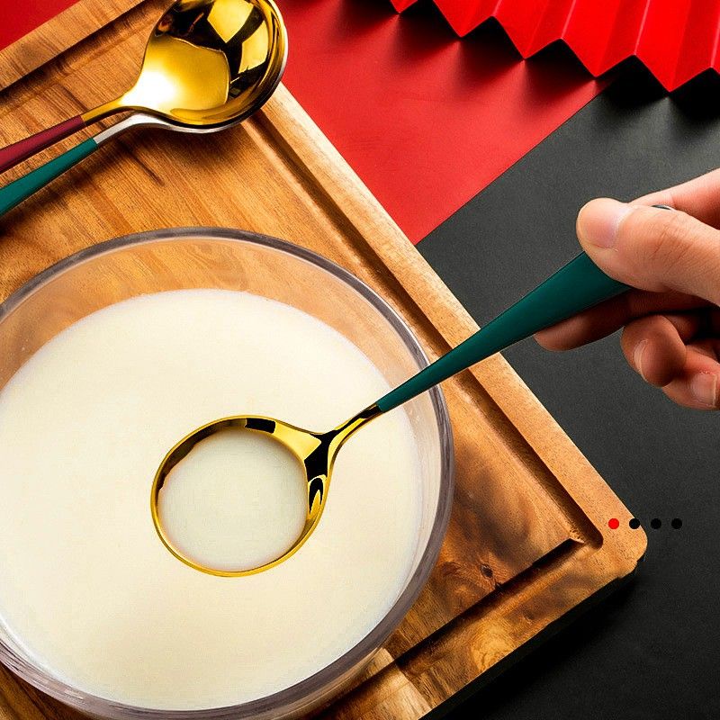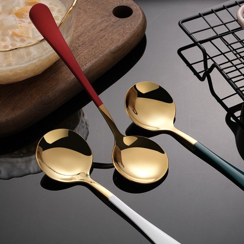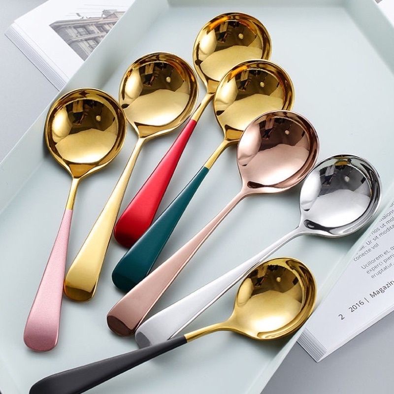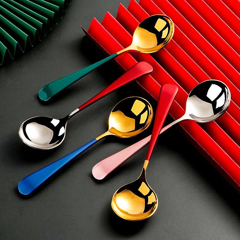 ✔️ Thìa Inox Mạ Vàng Cán Dài Nhiều Màu Với thiết kế tròn, rộng phù hợp khuôn miệng, dễ dàng xúc cơm, soup, cháo...