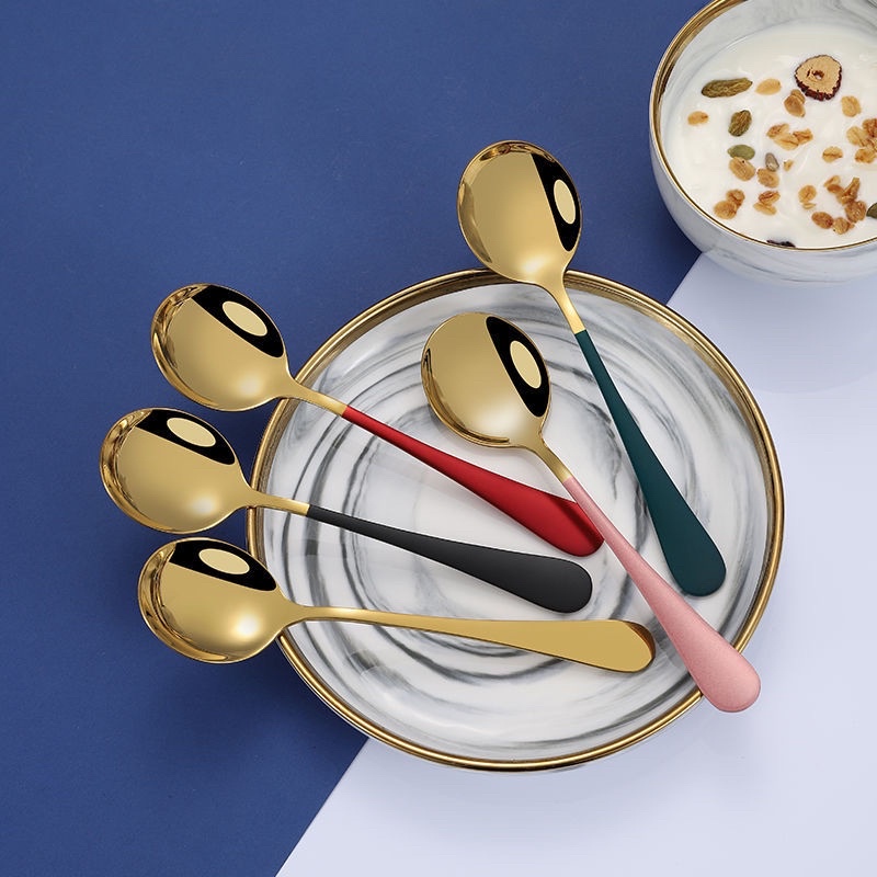 - Thìa Inox Mạ Vàng Cán Dài Nhiều Màu Với thiết kế tròn, rộng phù hợp khuôn miệng, dễ dàng xúc cơm, soup, cháo...
