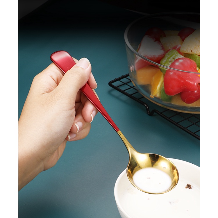• Chất liệu: Inox • Màu sắc: Mạ vàng và cán thìa có 5 màu ( hồng, đen, xanh dương, đỏ, xanh lục) – SHOP XIN PHÉP GIAO MÀU NGẪU NHIÊN
