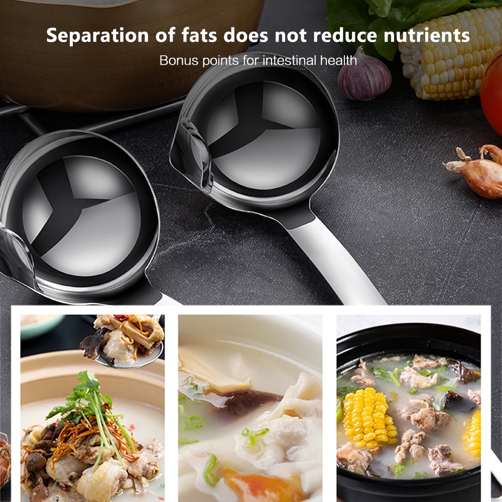 Miệng muỗng thiết kế thông minh giúp việc tách dầu mỡ dễ dàng, đồng thời vẫn sử dụng được như một muỗng canh thông thường với cạnh còn lại của muỗng.