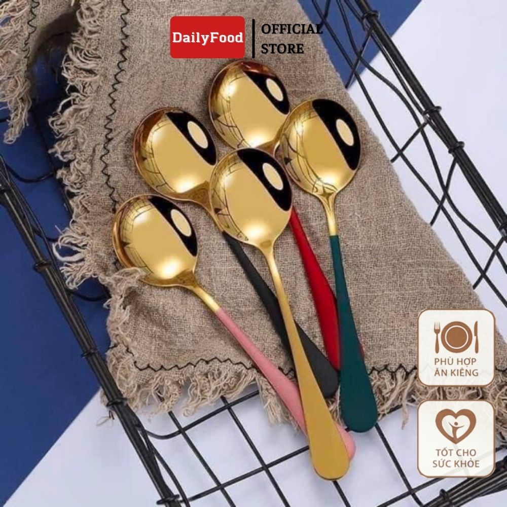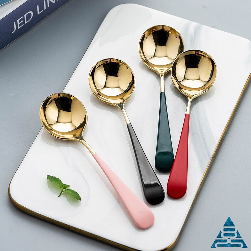 ✔️ Thìa Inox Mạ Vàng Cán Dài Nhiều Màu Với thiết kế tròn, rộng phù hợp khuôn miệng, dễ dàng xúc cơm, soup, cháo.