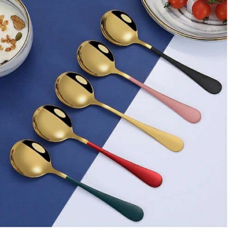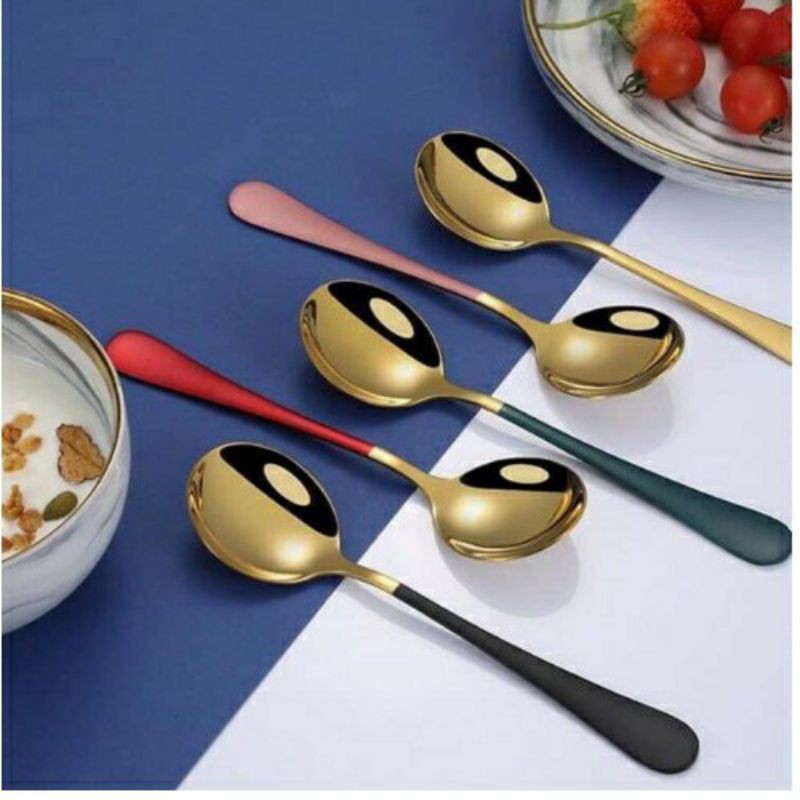 ✔️ Thìa Inox Mạ Vàng Cán Dài Với thiết kế tròn, rộng phù hợp khuôn miệng, dễ dàng xúc cơm, soup, cháo...