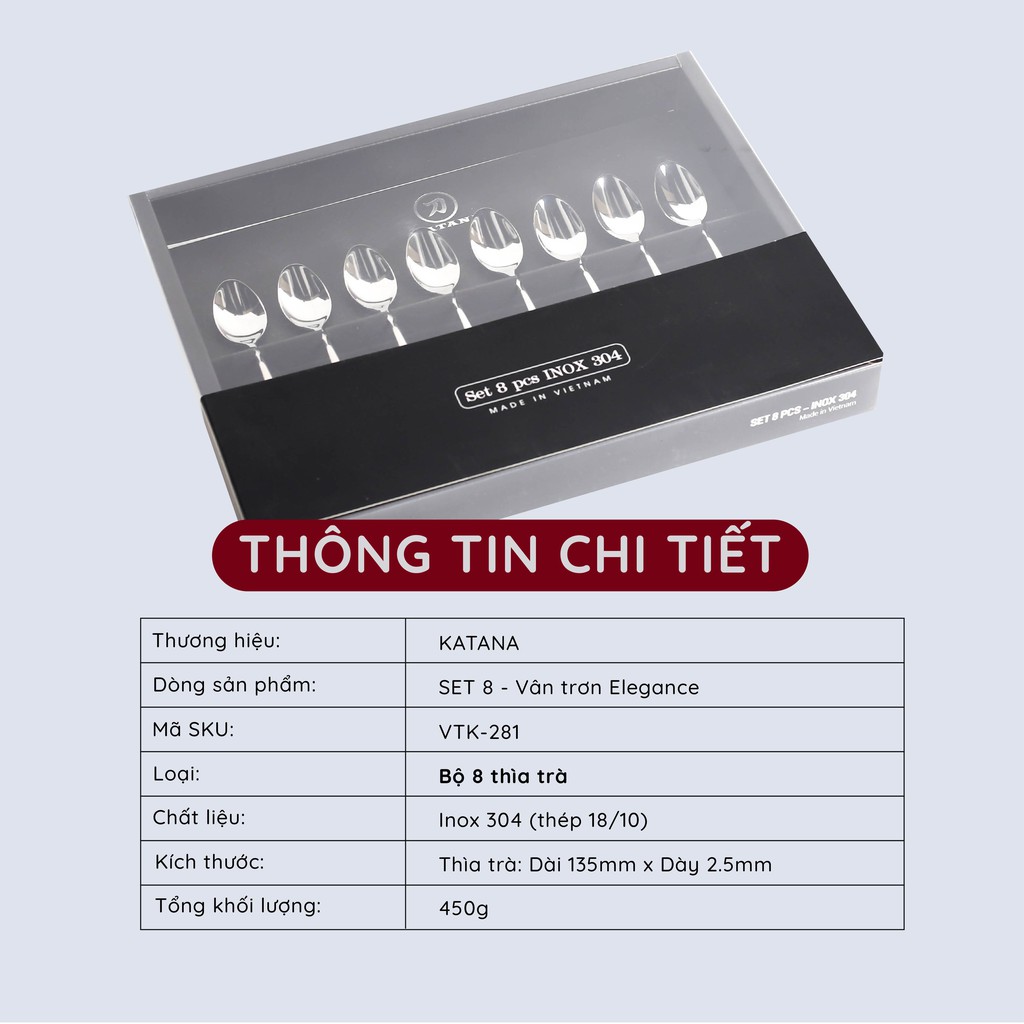 Giới thiệu Bộ thìa uống trà, cafe inox vân trơn KATANA Elegance VTK281 8 món