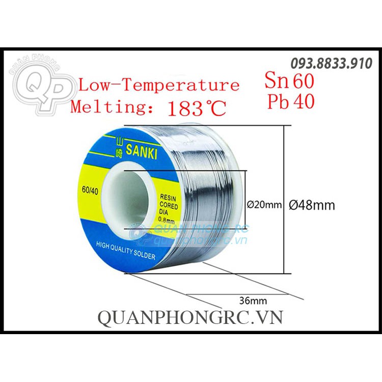Thiếc Hàn SANKI 0.8mm - 250gThiếc Hàn Sanki 0.8mm 250g là hợp kim có điểm nóng chảy khá thấp, khoảng từ 90 đến 450 °C (200 tới 840 °F), được sử dụng trong việc liên kết bề mặt các kim loại khác nhau.