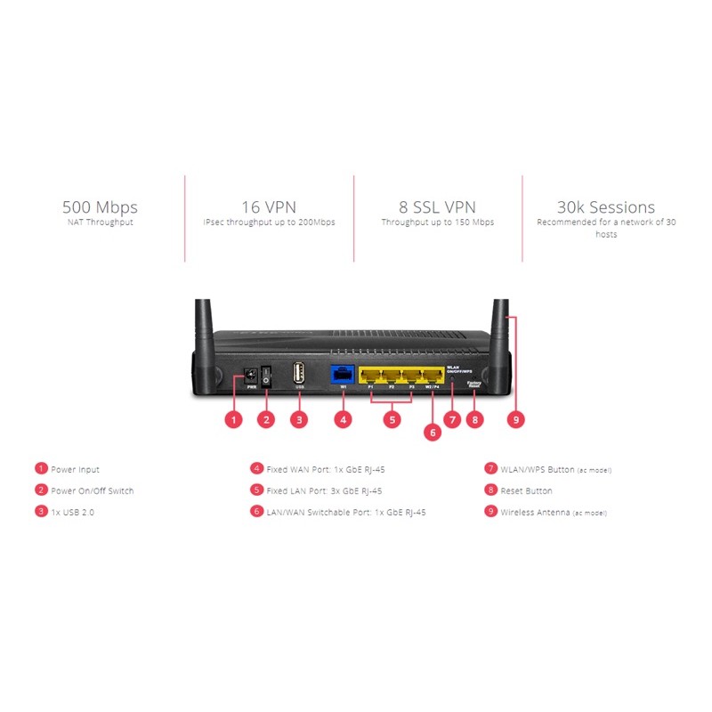 NAT Throughput lên đến 500Mbps, NAT sessions: 30.000,...