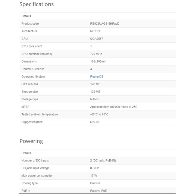 - RB922UAGS-5HPacD (International) supports 5150MHz-5875MHz range (Specific frequency range can be limited by country regulations).