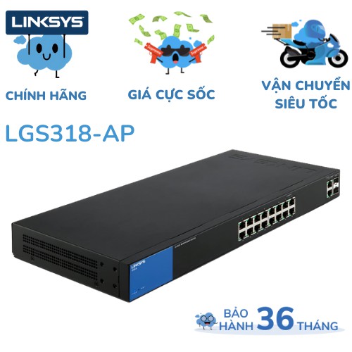 LINKSYS LGS318 SMART 16-PORT + 2SFP BUSINESS GIGABIT SWITCH• 16 x 10/100/1000Mbps cổng LAN Gigabit + 2 x 10/100/1000Mbps cổng combo RJ45/SFP Gigabit
