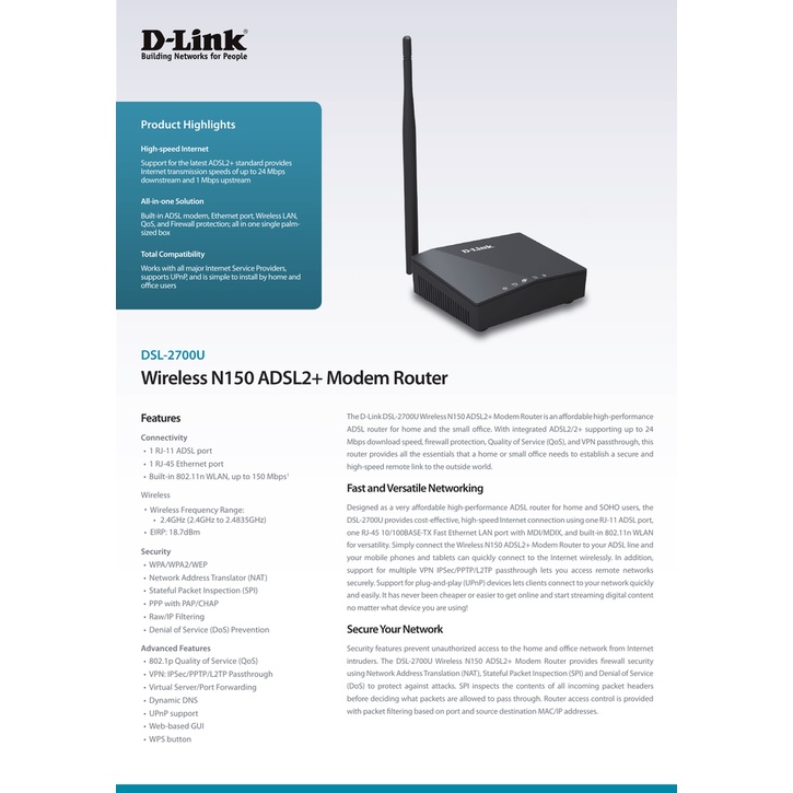 Giới thiệu Thiết bị định tuyến không dây hiệu D-link DSL-2700U Wireless N150 Modem Router