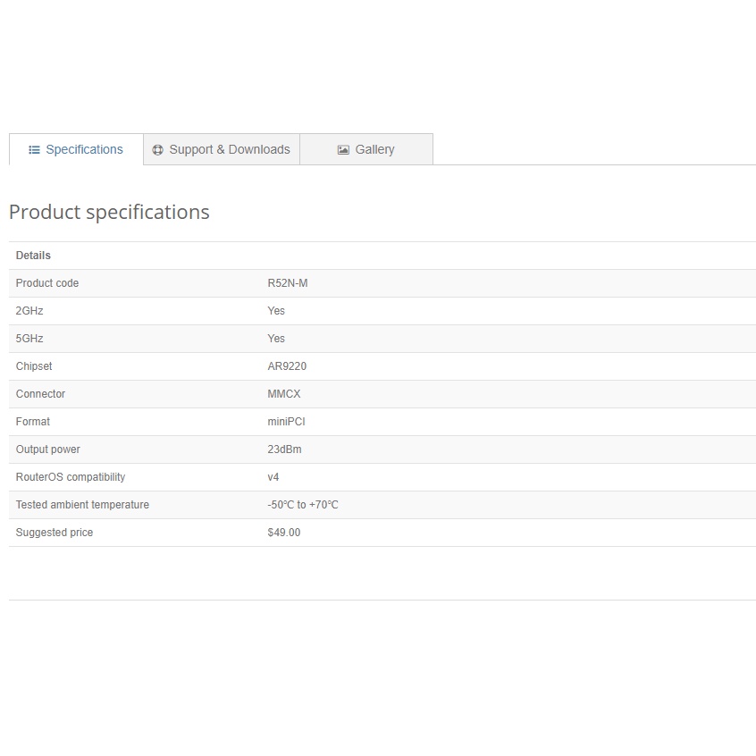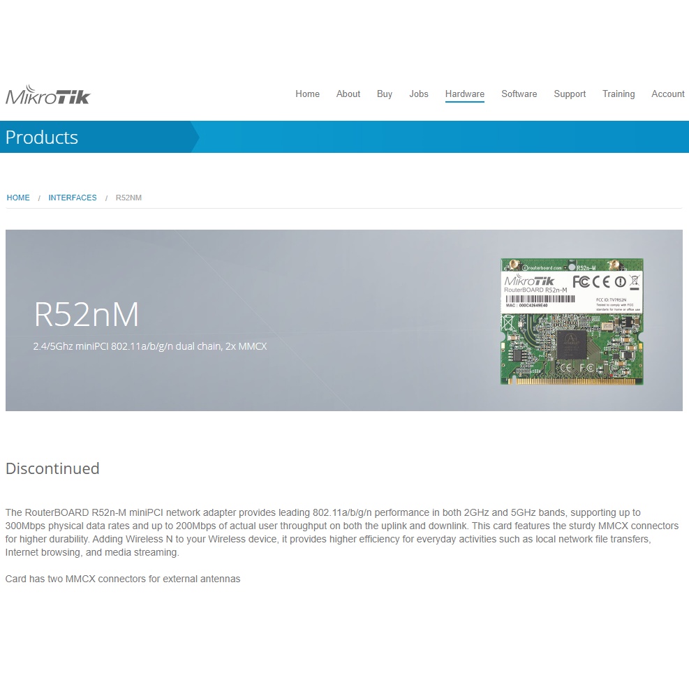 The RouterBOARD R52n-M miniPCI network adapter provides leading 802.11a/b/g/n performance in both 2GHz and 5GHz bands, supporting up to 300Mbps physical data rates and up to 200Mbps of actual user throughput on both the uplink and downlink. This card features the sturdy MMCX connectors for higher durability. Adding Wireless N to your Wireless device, it provides higher efficiency for everyday activities such as local network file transfers, Internet browsing, and media streaming.