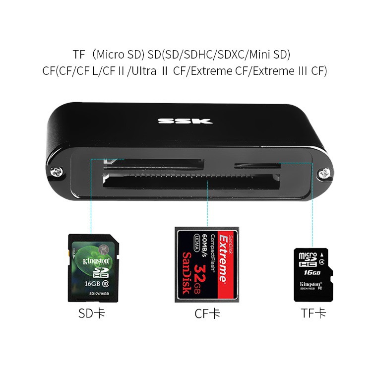 Tương thích với nhiều loại thẻ nhớ : SD / SDHC / SDXC / Micro-SD / Micro-SDHC / Micro-SDXC / T-Flash / CF.