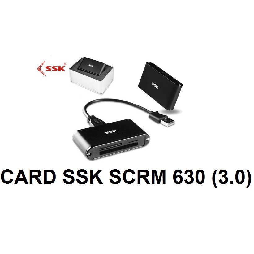 Thiết bị đọc thẻ nhớ SSK 3.0 SCRM 630 màu đen trong hộp thiếcCổng kết nối: USB 3.0, tốc độ truyền tải cao (5Gbps) và ổn định. Tương thích với USB 2.0/ 1.1