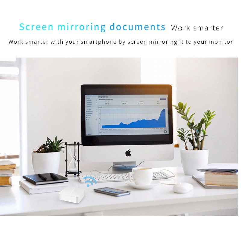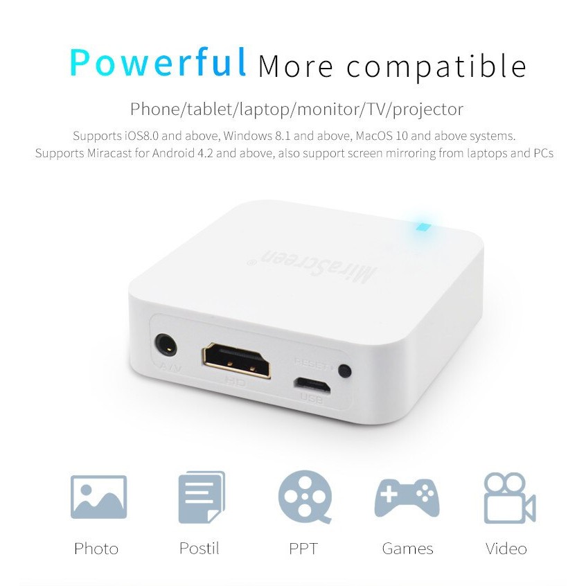 Phản chiếu không dây âm thanh, video, hình ảnh của điện thoại thông minh iOS và Android, máy tính bảng lên HDTV hoặc máy chiếu màn hình lớn.Hỗ trợ kết nối không dây 802.11b / g / n, WiFi 2.4GHz, tín hiệu mạnh, hỗ trợ hiển thị video, âm thanh, hình ảnh, game không dây.