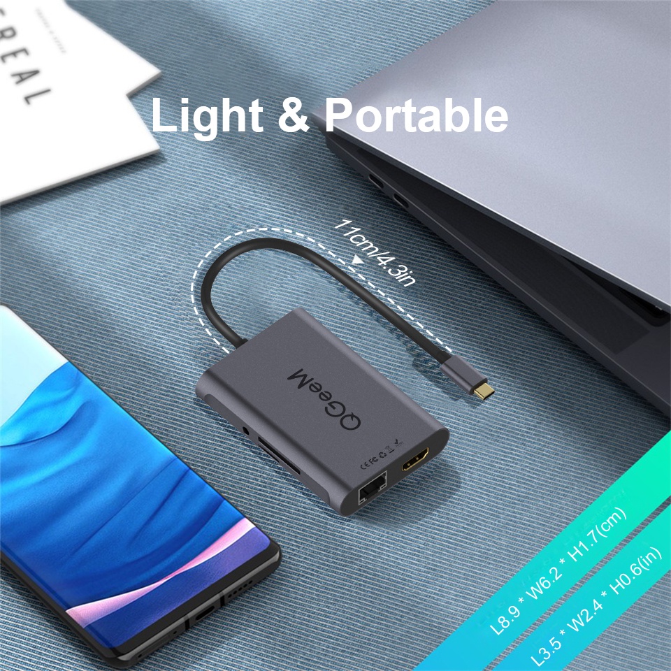 Bộ thiết bị Hub QGeeM USB C chia chuyển đổi 8 trong 1 4K, Type C sang HDMI Ethernet 1G, USB 3.0, 3.5mm AUX, TF, Cổng PD