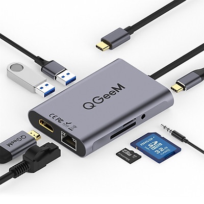 Máy tính & Laptop > Phụ Kiện Máy Tính > Bộ chia cổng USB & Đọc thẻ nhớ || Bộ thiết bị Hub QGeeM USB C chia chuyển đổi 8 trong 1 4K, Type C sang HDMI Ethernet 1G, USB 3.0, 3.5mm AUX, TF, Cổng PDCòn hàng