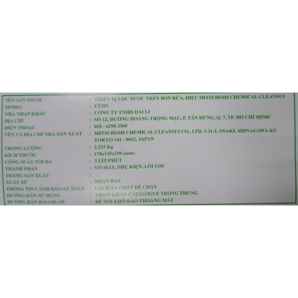 Thiết bị lọc nước trên bồn rửa Mitsubishi Cleansui ET201 của thương hiệu Cleansui và sản xuất tại Nhật Bản, thiết kế chắc chắn, dễ sử dụng, cung cấp nguồn nước sạch hằng ngày, lựa chọn đúng đắn cho gia đình Việt.