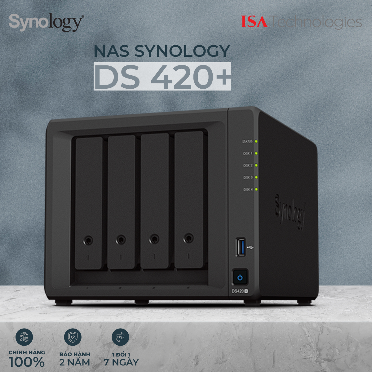 Nas DS420+ là một thiết bị lưu trữ mạng được sản xuất bởi hãng Synology. Với kích thước nhỏ gọn, Nas DS420+ được trang bị bốn ổ đĩa cứng 3,5 inch hoặc 2,5 inch để lưu trữ dữ liệu.