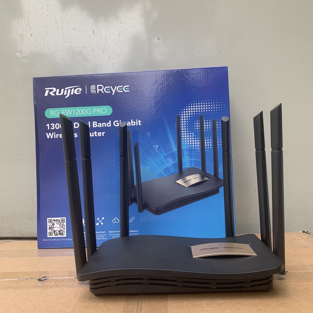 Thiết bị mạng phát wifi Ruijie RG-EW1200G PRO 6 râu siêu khỏe, tốc độ cao, bảo hành 3 nămThiết bị mạng phát wifi RUIJIE RG-EW1200G Pro là bộ định tuyến tiêu dùng không dây băng tần kép Gigabit được thiết kế cho mọi loại hình gia đình và các trường hợp SOHO khác. Nó đi kèm với chuẩn Wi-Fi 802.11ac Wave2 thế hệ tiếp theo tăng tốc lên đến 1267Mbps, cho phép phát trực tuyến và chơi game trực tuyến 4K ổn định. Với bộ khuếch đại công suất cao tích hợp và nhiều ăng-ten bên ngoài, ngoài ra, với công nghệ MU-MIMO và công nghệ tạo chùm, EW1200G Pro mang đến phạm vi phủ sóng Wi-Fi tối ưu trong tất cả các kiểu nhà.