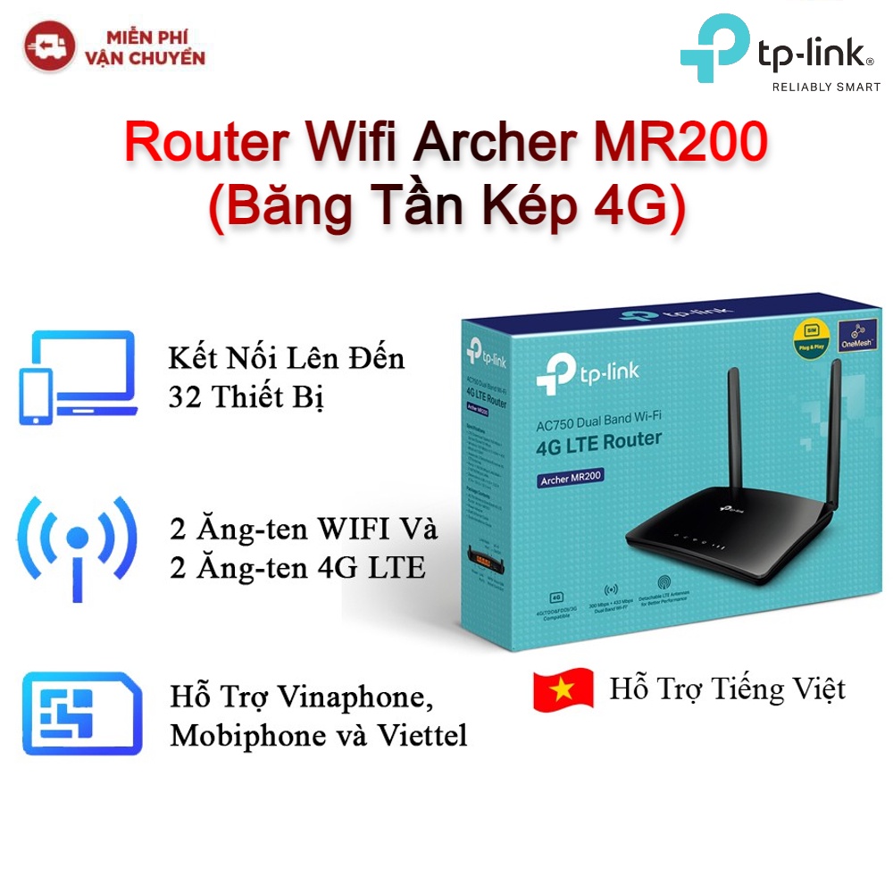 Máy tính & Laptop > Thiết Bị Mạng > Bộ Phát Wifi || Thiết bị mạng Router Wifi TP-LINK Archer MR200 (Băng Tần Kép 4G)Còn hàng