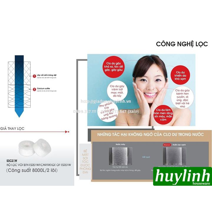 - Có 2 lõi lọc khử Clo và độ đục trong nước hiệu quả, an toàn cho da nhạy cảm, hạn chế rụng tóc.