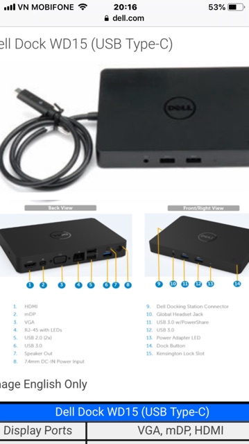 Máy tính & Laptop > Phụ Kiện Máy Tính > Bộ chia cổng USB & Đọc thẻ nhớ || Thiết bị mở rộng cổng giao tiếp Dell USB-C WD15 Docking Station - K17ACòn hàng